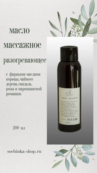 Массажное разогревающее масло. В составе подобраны масла с разогревающими и антисептическими свойствами. Базовое мало - сладкого миндаля имеет свойства, близкие к теплым, хорошо увлажняет и питает, кожа после него мягкая и эластичная, напитанная влагой. Эфирное масло корицы имеет горячие свойства, сильный приятный, успокаивающий аромат, оно определяет назначение продукта - разогревает кожу, делает ее более восприимчивой к массажу. Эфирное масло розы - нейтральное, тонизирует, способствует регенерации клеток, подтягивает омолаживает. Сандал - одно из основных масел Востока, дезинфицирует, омолаживает. Эфирное масло марокканской ромашки - редкое масло голубоватого цвета, антисептическое, эпителизирующее. Аромат масел, где преобладают запахи корицы и розы, приятен, успокаивает и расслабляет, создает ощущение легкости и покоя.