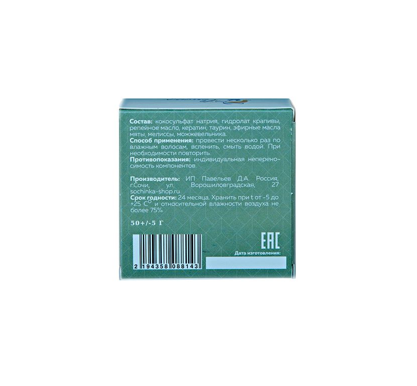 Состав: кокосульфат натрия, гидролат крапивы, репейное масло, льняное масло, кератин, таурин, эфирные масла мяты, мелиссы, можжевельника.