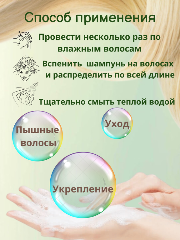 Способ применения: провести несколько раз по влажным волосам, вспенить, смыть водой. При необходимости повторить.