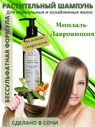 Растительный бессульфатный шампунь "Миндаль - Лавровишня" мягко промывает, увлажняет и питает волосы, не оставляет жирности, улучшает структуру волос.