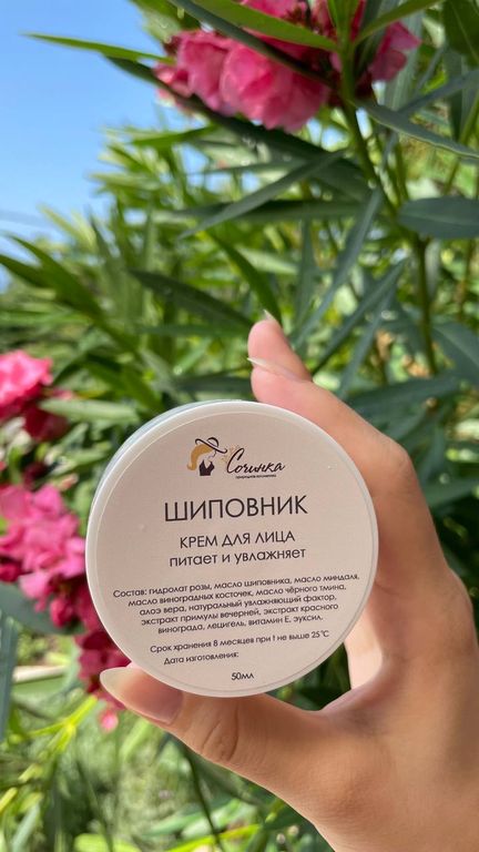 Крем для лица Шиповник предназначен для всех типов кожи, хорошо подойдет для сухой и нормальной кожи. Текстура крема плотная, наносится равномерно, легко распределяется по коже, быстро впитывается, не оставляет липкости и создает ощущение бархатистости. Масла шиповника и черного тмина питают, обладают антиоксидантной активностью, увлажняет и способствует регенерации кожи. Алоэ вера интенсивно увлажняет. Экстракт красного винограда за счет богатого содержания ресвератрола оказывает антиоксидантное действие, стимулирует выработку коллагена. Не содержит отдушки, приятный запах крема создан с помощью использования гидролата розы.