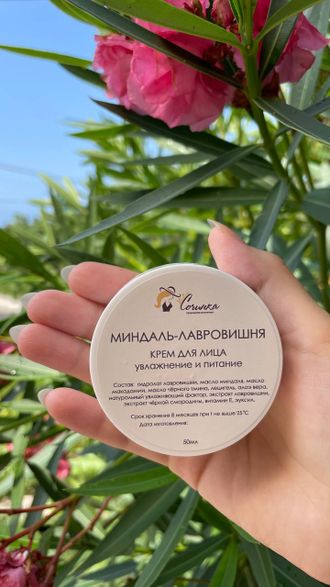Крем "Миндаль-лавровишня" Увлажнение и питание 50 г. Крем предназначен для всех типов кожи, для ежедневного ухода. Имеет нежную легкую текстуру, хорошо распределяется по коже, впитывается не оставляя жирного блеска. Экстракт лавровишни омолаживает, способствует выработке коллагена, упругости кожи. Масла Миндаля, макадамии, черного тмина смягчают, питают и увлажняют, замечательно подходят для зрелой, сухой и чувствительной кожи. Алоэ вера интенсивно удерживает влагу в поверхностных слоях кожи. Не содержит отдушки. Притягательный аромат лавровишни в креме мы сохранили благодаря бережным технологиям.